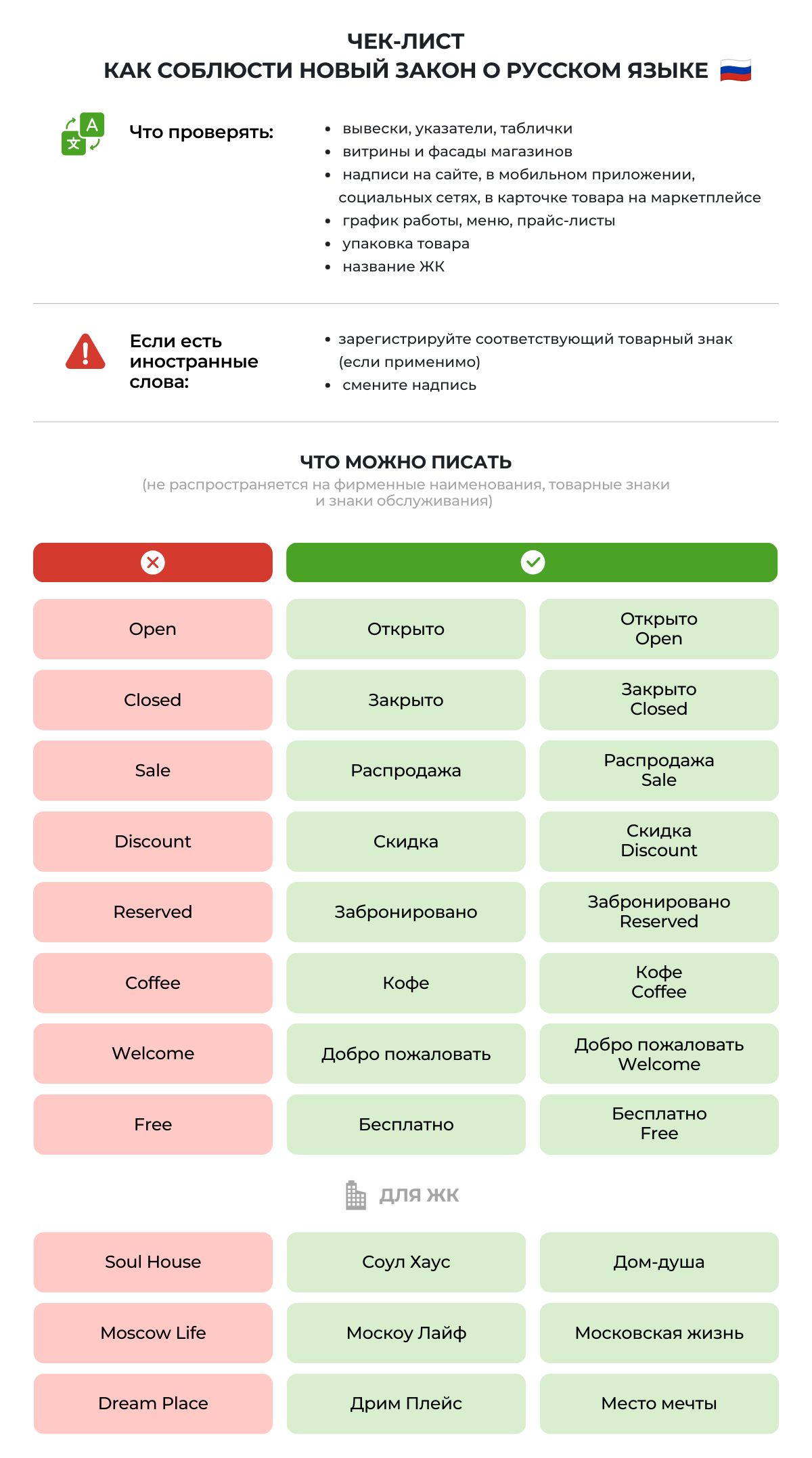 Сейчас бизнесу нужно исходить из того, что все — и информационные, и рекламные конструкции — должны быть выполнены либо только на русском, либо с равнозначным по содержанию и оформлению дублированием на русском языке.